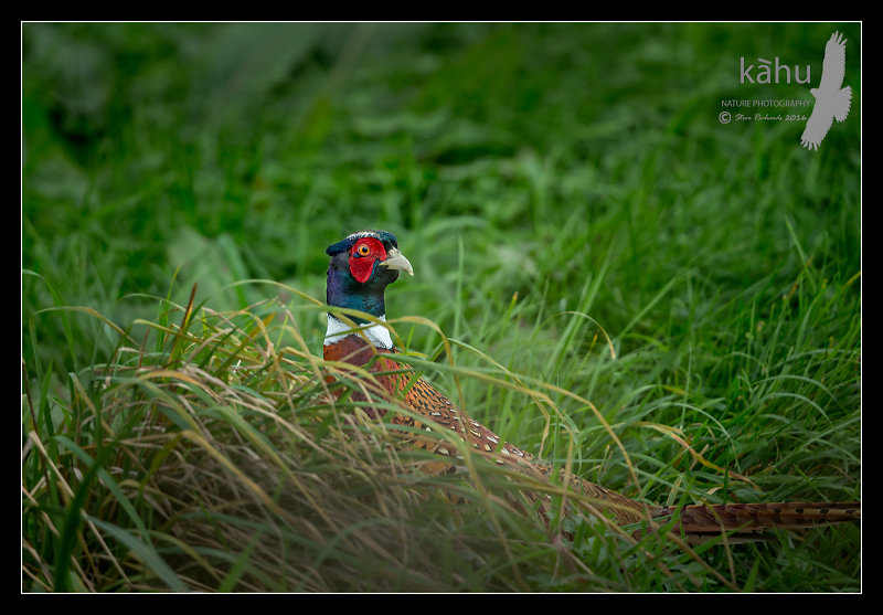 Cock Pheasant tries to hide behind a tuft of grass